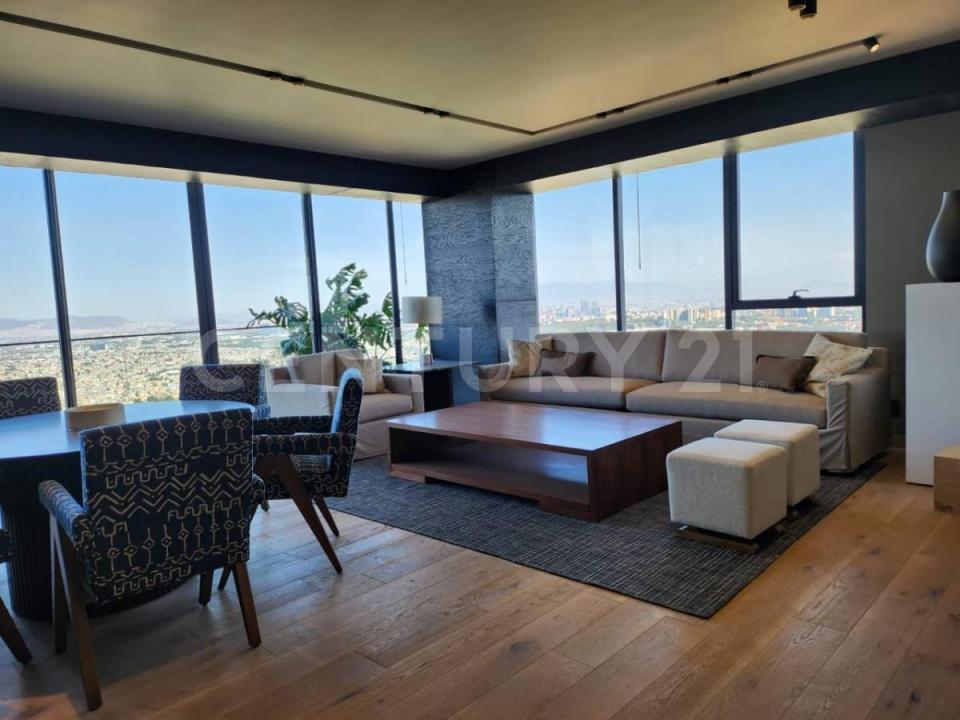 El departamento cuenta en el primer piso con 2 amplios espacios para sala, comedor, cava y bar, cocina integral con desayunador e isla, alacena, una terraza de 42m2 para disfrutar al aire libre, estudio, bano de visitas, cuarto de servicio con bano completo, cuarto de lavado y planchado, una bodega interior. En el segundo piso, cuenta con 4 amplísimas recámaras, cada una con su vestidor y bano, cuarto de TV y una terraza de 37m2 que recorre y da la vuelta alrededor de la recámara principal. Además el departamento cuenta con una segunda bodega en sótano y 3 lugares de estacionamiento.