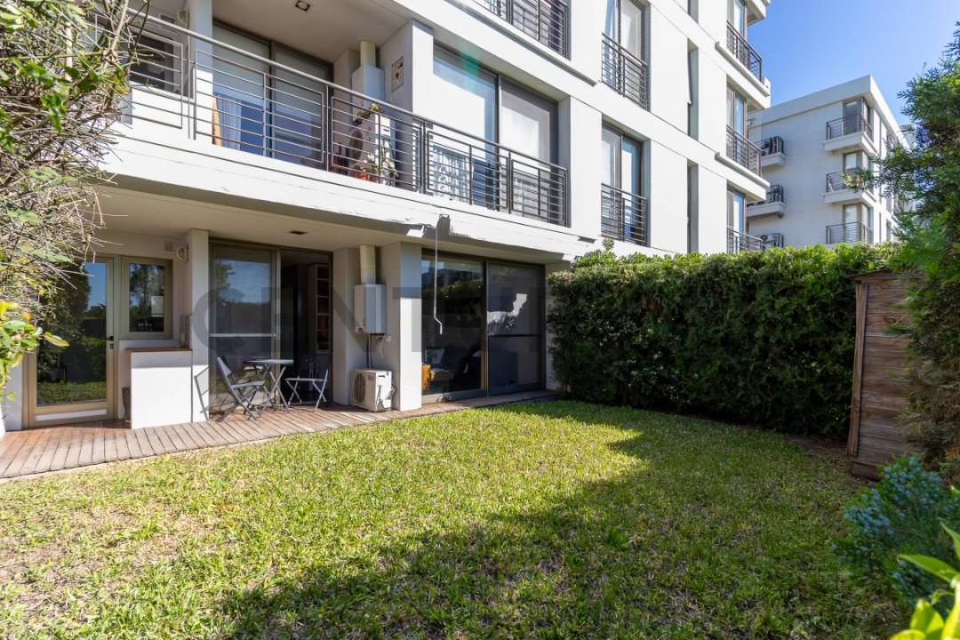 VENTA DEPARTAMENTO SAN ISIDRO PB CON JARDIN MONOAMBIENTE DIVIDIDO. Con un mueble que oficia de divisor, sin interrumpir el paso de luz. Suite con vestidor, pisos de madera, bano completo con banera, posee aire acondicionado, cocina larga luminosa y ventilada, galería con lavadero en el jardín, servicios individuales, caldera individual, con salida al jardín, al igual que el living y el comedor, todo con ventanales super amplio, DVH y mosquiteros, galería con deck y parrilla, nos guía un jardín verde natural con bellas especias de plantas que limitan con el complejo. Superficie cubierta: 70 m2 aprox. y descubiertos 40 m2. Total 110 m2. Apto crédito!!! Te esperamos!!!