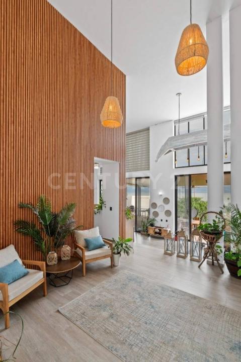 Planta baja: Cochera para cuatro autos con portón eléctrico, lobby de ingreso, tres habitaciones, un bano completo, vestíbulo, estudio con aislante de sonido, sala y cocina integral con isla central de granito para ocho personas, cuarto de servicio, salón de juegos con bano con completo. Los techos a doble altura y grandes ventanales de piso a techo generan amplitud y flujo abundante de luz natural y ventilación.
